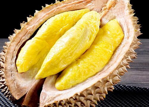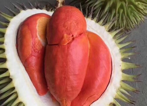 红虾榴莲棕黄色果壳,外形较圆,果刺稀疏。果肉是橙红色的,它虽不及顶级猫山王来的绵密可口,但肉质细滑,入口即化,苦甘味极浓。